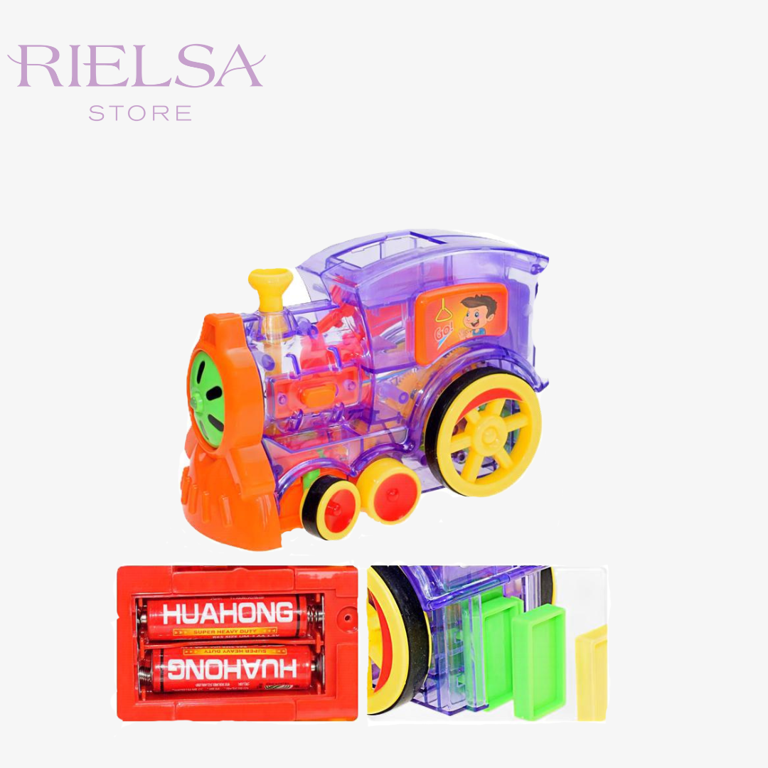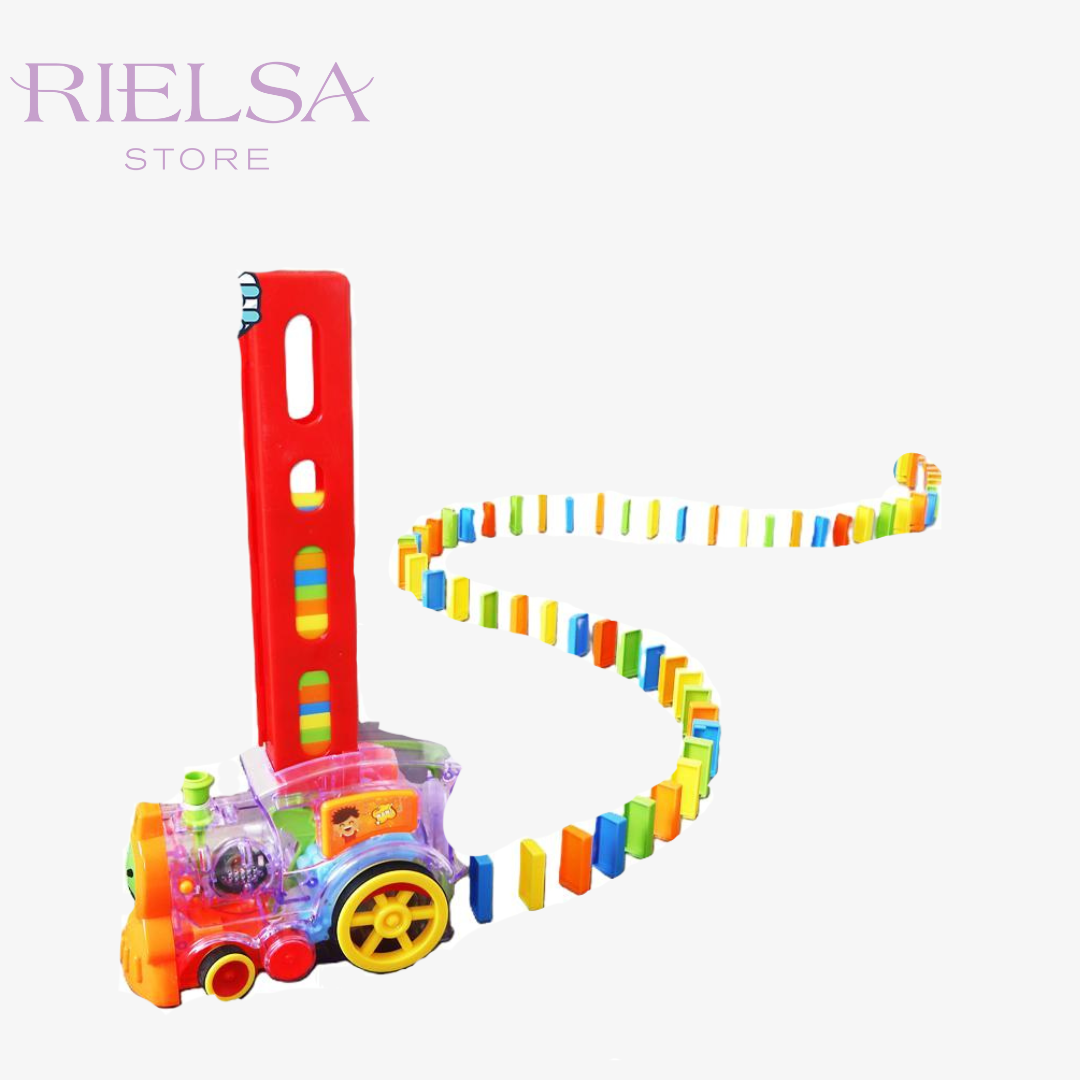 Luz y Sonido (¡Más Entretención!): La locomotora es transparente y colorida, con luces y sonidos que capturan la atención de los más pequeños. ¡El espectáculo empieza antes de que caigan los dominós!